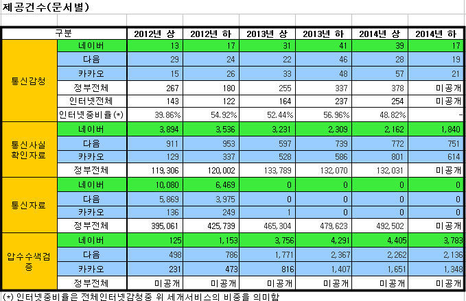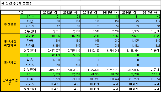 먼저 통신자료 제공이 그렇다. 양사가 밝혔다시피 통신자료 제공이 법적 강제가 아니라 사업자 재량사항이라는 헌법재판소 결정이 있었고, 구체적인 기준 없이 이용자 인적사항을 제공한 데 대해 손해배상을 인정한 고등법원 판결도 있었다. 때문에 2012년 10월 이후 양사를 비롯한 인터넷기업들은 영장 없는 통신자료 제공을 중단한 상황이다. 그러나 자료 제공을 중단하기 직전 상황을 보면 통신자료 제공이 대단히 남발되었음을 추정할 수 있다.