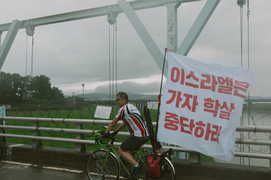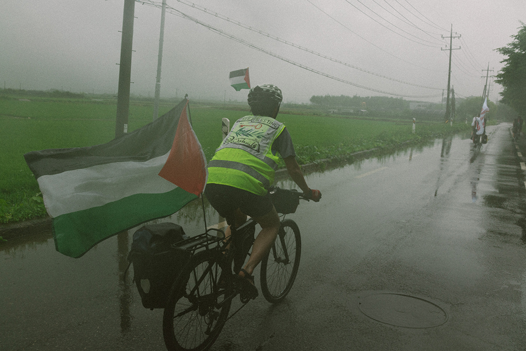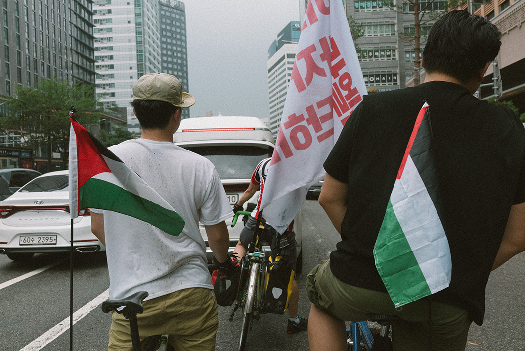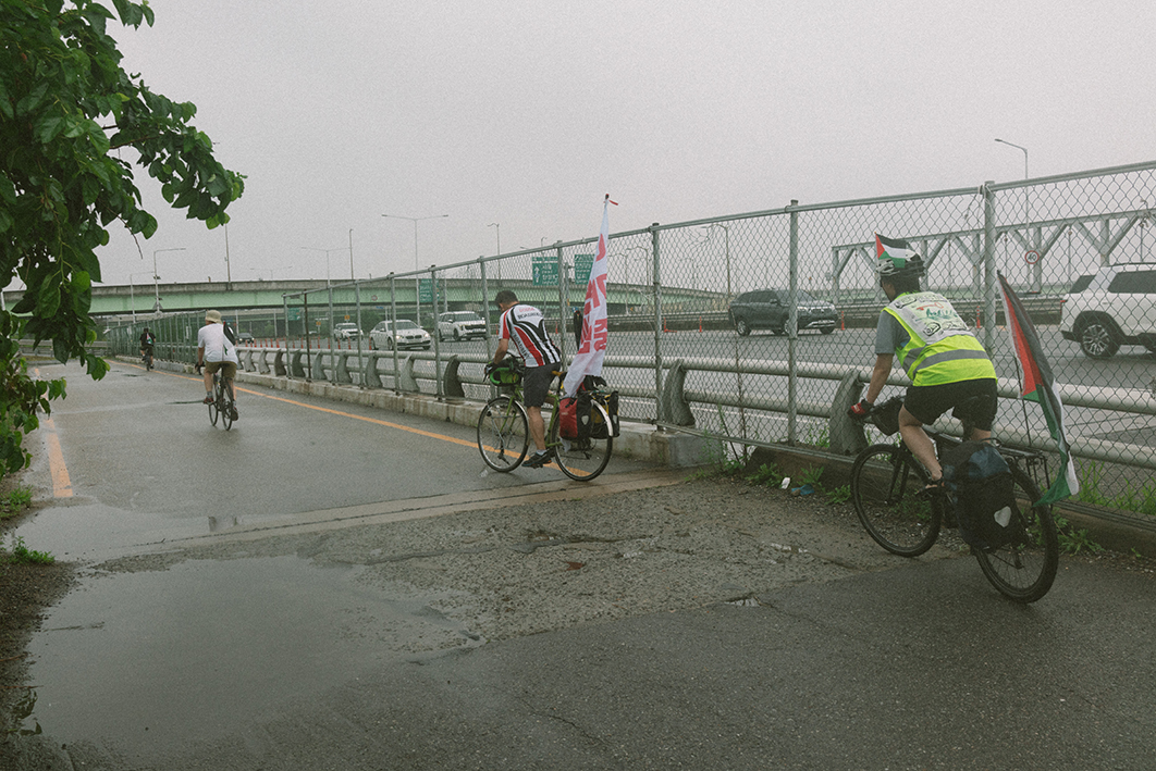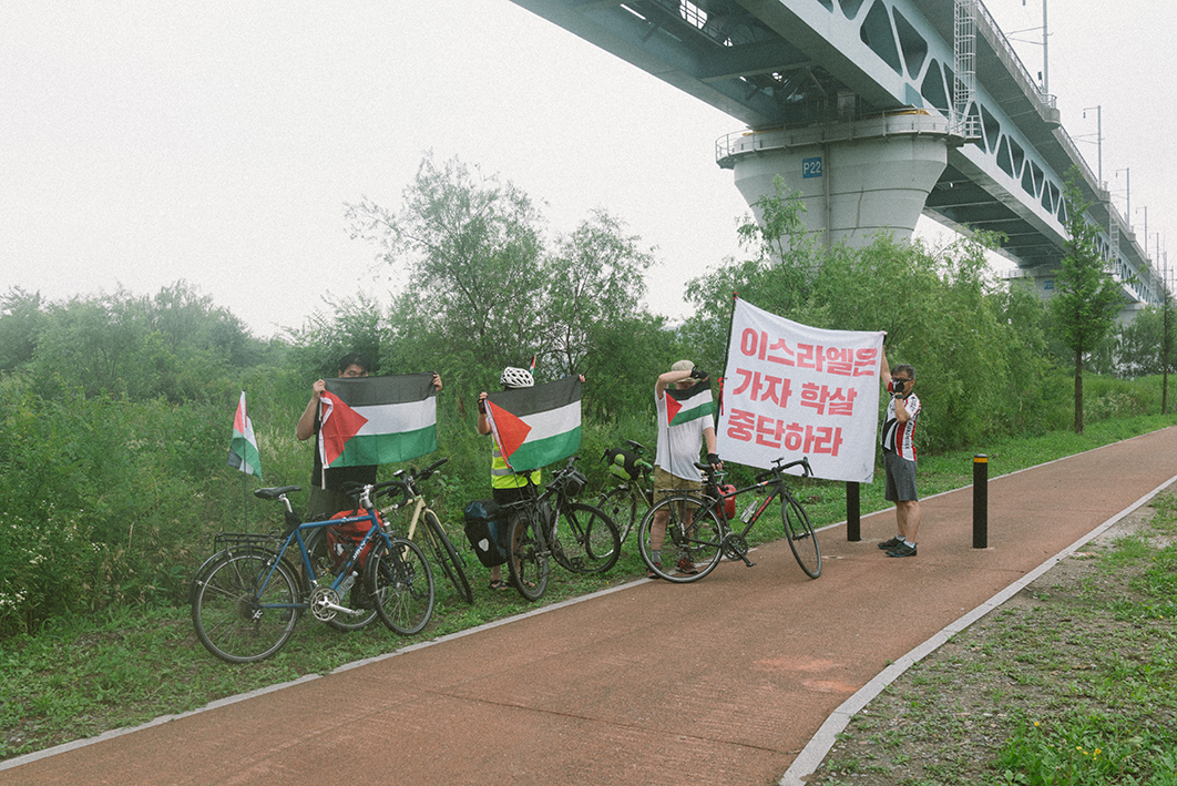 지난주 토요일(28일) 긴급행동 집회에 앞서 진행된 팔레스타인 해방과 연대하는 자전거 타기를 무사히 마무리했습니다. 5명의 참가자들은 비내리는 파주 임진강 유역에서 출발하여 한강을 따라 약 58km를 이동하며 집단학살을 규탄하고 해방에 연대하는 목소리를 높혔습니다. 집회에서의 연대 발언 내용을 아래에 공유합니다.