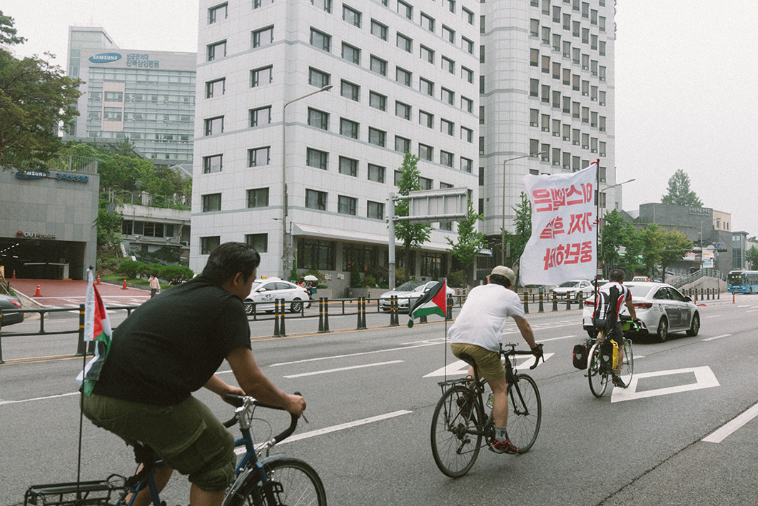 오늘날까지도 집단학살은 계속되고 있습니다. 특히 2023년 10월 이후 가자지구에서는 매일 10명의 어린이가 한쪽, 또는 양쪽 다리를 잃고 있습니다. 귀환 대행진 이후 많은 도시에서 팔레스타인 해방에 연대하는 자전거타기가 진행되어 왔습니다. 이 도시에서 함께 살아가는 이들에게 우리의 연대를 표현하며 자전거타기를 통해 이야기하고 싶은 것은 단 하나 입니다. 팔레스타인 사람들도 우리와 마찬가지로 인간이라는 것입니다. 세상 모든 다른 사람들과 마찬가지로 팔레스타인 사람들도 자유롭게 이동할 권리, 집으로 돌아갈 권리, 존엄하게 살아갈 권리가 있습니다. 우리는 오늘 집회가 끝나면 자전거를 타고 천천히 페달을 굴려 각자의 집으로 돌아가 평온하게 잠들 것입니다. 팔레스타인 사람들도 마땅히 그럴 수 있어야 합니다. 그들의 집이 10km 떨어진 곳에 있든, 50km 떨어진 곳에 있든 어떠한 장벽도 군사적 위협도 없이 언제라도 자신의 집으로 땅으로 돌아갈 수 있어야 합니다. 우리는 팔레스타인과 연대하고 함께 저항함으로써 우리 자신의 인간성을 지키고자 합니다. 팔레스타인에 진정한 해방과 평화가 깃들 때까지 함께하겠습니다.