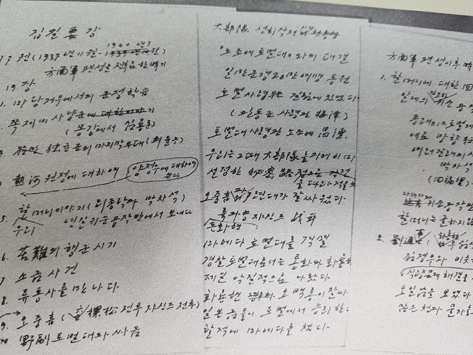 오 사령과의 합작이 그렇게 순조롭게 이루어질 수 있었던 것은 우리의 힘이 강했고 정치도덕적 풍모가 구국군보다 우월했기 때문이며 우리의 열렬한 애국심과 국제주의적 우애심, 자기 신념의 정당성이 그를 공감시켰기 때문이었다. 나는 구국군과의 합작을 실현한 그때부터 통일전선을 위한 최상의 수단은 주체적 힘이라는 것, 이 힘을 키우지 않고서는 어떤 우군이나 우방과도 연합하여 투쟁할 수 없다는 것을 좌우명으로 삼고 혁명의 주체를 튼튼히 하기 위한 투쟁을 일생 동안 벌여왔다.(이상 3권 184)