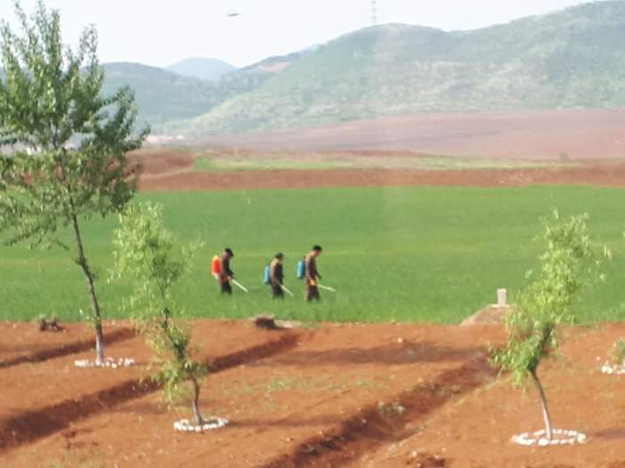 ▲ 마을 사람들은 3인이 1조로 농약 작업을 하고 있다.