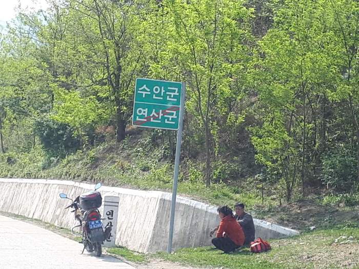 ▲ 연산군을 지나 수안군에 접어들었다. 오토바이 타고가다 도로가에 세워두고 시간에 쫒기지 않은 듯 한가롭게 정담을 나누고 있는 저 모습… 남녀의 데이트로 보여 정겹다.