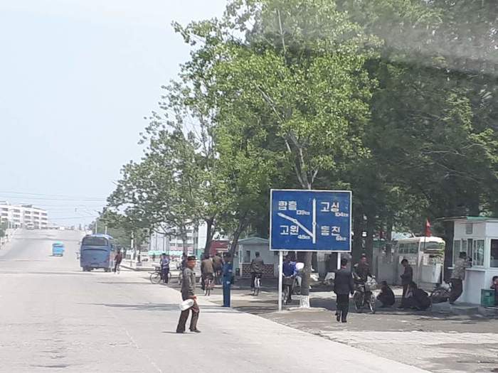 ▲ 시내 첫 머리의 이정표... 함흥 130 km, 고원으로 좌측으로 통천과 고성으로 104km