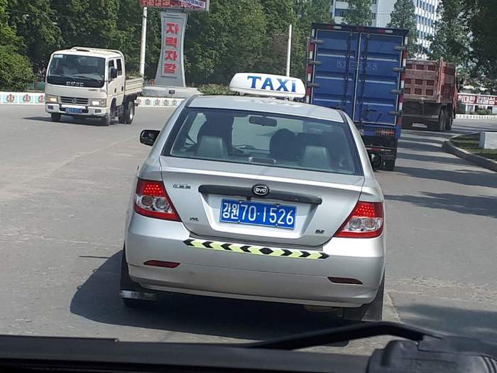 ▲ 원산시내에서...택시를 보다. 그리고 도로에는 어김없이 자력갱생 구호가 있다.