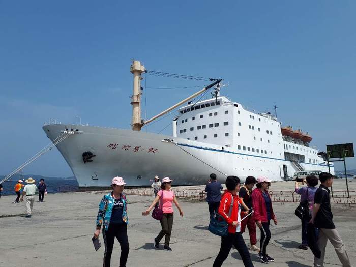 ▲ 원산항에 정박해 있는 만경봉호...그 앞을 관광객들이 지난다.