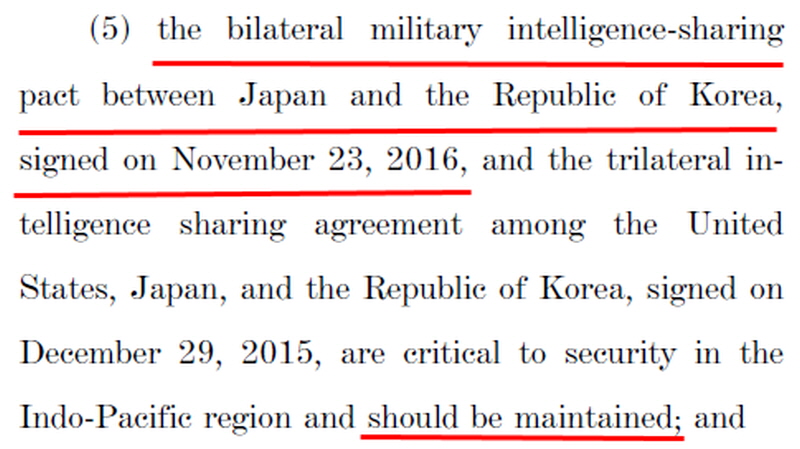 NDAA는 곧바로 “2016년 11월 23일 서명된 한일 양자 간의 군사정보 공유 협정과 2015년 12월 29일 서명된 한미일 3자 간 군사정보 공유 협정은 인도·태평양 지역의 안보에 매우 중요하며(critical) 그리고 유지돼야 한다”고 못을 박았다.