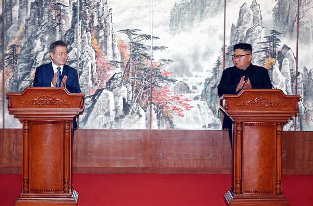 ▲ 지난 2018년 9월 19일 평양에서 열린 남북 정상회담에서 문재인(왼쪽) 대통령과 김정은 북한 국무위원장이 평양 백화원에서 회담을 마친 뒤 '9월 평양 공동 선언'을 발표하고 있다. ⓒ평양사진공동취재단