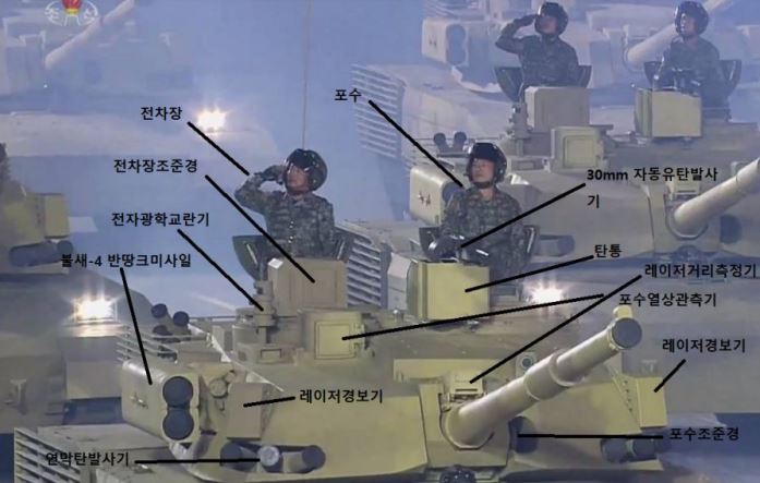 다른 나라의 땅크들과 다르게, 조선의 저격땅크는 차체 왼쪽 측면에 레이저유도식 반땅크미사일 발사관 2문을 장착했다. 이 반땅크미사일의 이름은 불새-4다. 불새-4 이전에 개발된 반땅크미사일인 불새-3은 2016년 2월 26일에 시험발사되었는데, 불새-3의 사거리는 5.5km다. 이런 사정을 살펴보면, 이번 야간열병식에 등장한 불새-4 레이저유도식 반땅크미사일의 사거리는 7km 정도인 것으로 추정된다. 엄청난 사거리다.