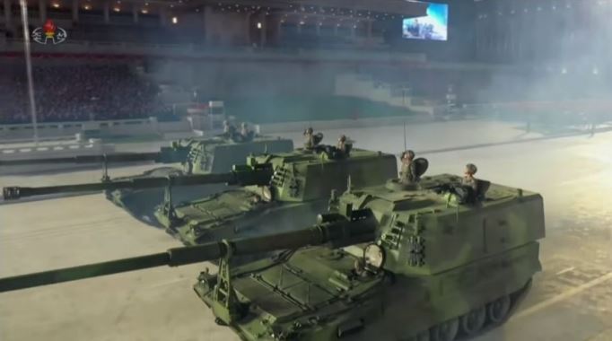 1) 이번 야간열병식에서 저격땅크의 뒤를 이어 등장한 무장장비는 신형 자행포다. 지탱바퀴 6개가 달린 무한궤도장갑차 위에 152mm 자행포가 탑재되었다. 조선인민군 포병부대들이 운용해온 기존 자행포는 170mm 자행포와 152mm 자행포인데, 지탱바퀴 5개가 달린 무한궤도차량 위에 탑재되었다.