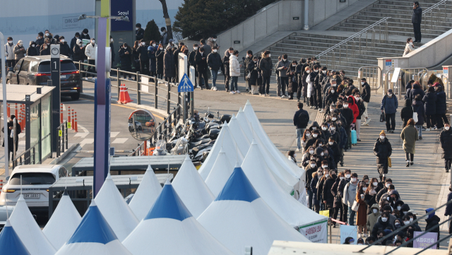 ▲코로나19 변종 오미크론 확산세가 거센 가운데 21일 오전 서울 중구 서울역 코로나19 임시 선별검사소에서 시민들이 검사를 받기 위해 줄을 서 있다. ⓒ연합뉴스