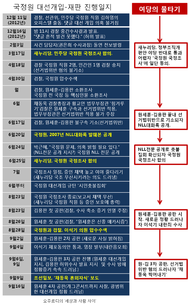 ‘내란죄’ 약발이 신통하지 않아 고심하고 있는 동안 원세훈-김용판 공판은 계속됐다. 검찰은 9월 16일까지 총 4차례 진행된 ‘원세훈 공판’에서 새로운 증거와 정황을 제시했다.