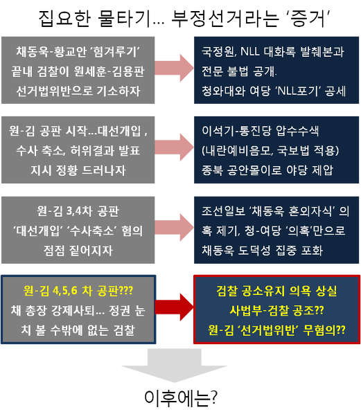 채 총장 사퇴 이후가 문제다. 국정원 대선개입 사건의 진상규명을 방해해 12.19부정선거 논란을 사전에 차단하겠다는 저들의 시도는 그간 정치적 중립을 표방한 채동욱 총장 체제의 검찰에 의해 저지당해 온 게 사실이다.