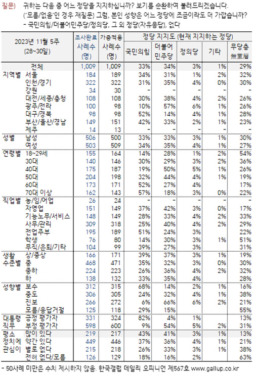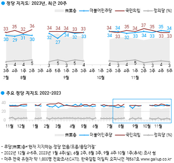 1일 여론조사 전문기관 한국갤럽은 “2023년 11월 다섯째 주(28~30일) 전국 만 18세 이상 국민 1009명을 대상으로 현재 지지하는 정당을 물은 결과, 국민의힘 33%, 더불어민주당 34%, 정의당 3%, 기타 정당·단체 1%, 지지하는 정당 없는 무당(無黨)층 29%로 나타났다”고 발표했다.