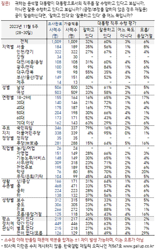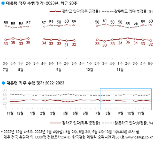 1일 여론조사 전문기관 한국갤럽은 “2023년 11월 다섯째 주(28~30일) 전국 만 18세 이상 유권자 1,009명에게 윤석열 대통령이 현재 대통령으로서의 직무를 잘 수행하고 있다고 보는지 잘못 수행하고 있다고 보는지 물은 결과, 32%가 긍정 평가했고 60%는 부정 평가했으며 그 외는 의견을 유보했다(어느 쪽도 아님 3%, 모름/응답거절 6%)”고 밝혔다.