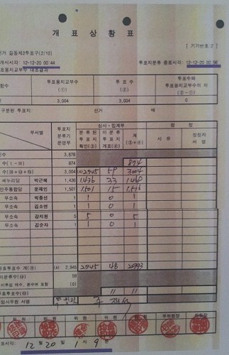 위의 자료에서 보시는 바와 같이 어느 투표구에서 누가 몇 표를 얻었으며, 언제 분류를 시작해서 언제 끝났는지 그리고 언제 이 내용을 중앙선관위에 전송했는지에 이르기까지 상세히 적혀 있으며, 이 결과에 대해 위원들과 위원장에 이르기까지 적지 않은 책임자들이 자신의 도장을 찍어 서명날인하였습니다. 이것이 바로 개표상황을 알리는 '최초의 문서'입니다.