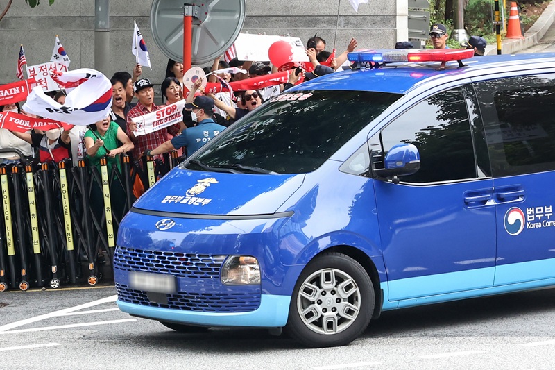 지난 18일 오후 서울 서초구 서울중앙지방법원에서 구속적부심사 심문을 마친 윤석열 전 대통령이 탑승한 호송차량이 서울구치소로 향하고 있다. 2025.7.18 ⓒ뉴스1 “ 남소연 기자 ” 응원하기