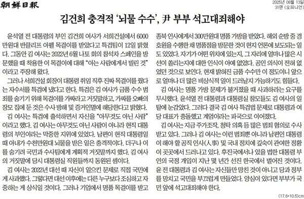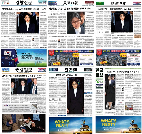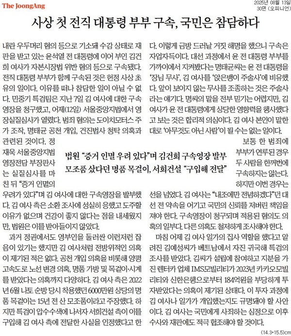 동아일보는 2면 <서희건설 “尹당선 선물로 김건희에 ‘나토 목걸이’ 줬다” 실물 제출> 기사에서 “김 여사는 그동안 이 목걸이에 대한 진술을 네 번이나 번복해 왔다. 정상회의 참석 이후 목걸이에 대한 논란이 일자 당시 대통령실은 ‘현지에서 빌렸다’고 해명했지만, 이후엔 ‘지인에게 빌린 것’이라고 입장이 바뀌었다. 이후 특검 수사가 임박하자 올 5월 입장을 바꿔 ‘해당 목걸이는 모조품’이라는 의견서를 검찰에 제출했다. 그러다 김 여사가 6일 특검에 나와 조사받을 때엔 ‘2009, 2010년경 모친 최은순 씨에게 선물하려고 홍콩에서 200만 원짜리 모조품을 구입했다’고 또다시 진술을 바꿨다”라고 보도했다.