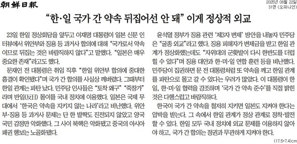 조선일보는 “문재인 전 대통령은 취임 직후 ‘한일 위안부 합의에 중대한 흠결이 확인됐다’며 국가 간 합의를 사실상 깨버렸다”며 “그때부터 한일 관계는 파탄났다. 민주당 인사들은 ‘토착 왜구’ ‘죽창가’라며 반일(反日) 몰이를 국내 정치에 이용했다”고 비판했다. 이어 “일본은 국제 무대에서 ‘한국은 약속을 지키지 않는 나라’라고 비난했다”며 “위안부·징용 등 과거사 문제는 단 한발짝도 진전되지 않았고 양국 국민 감정만 악화했다”고 지적했다.