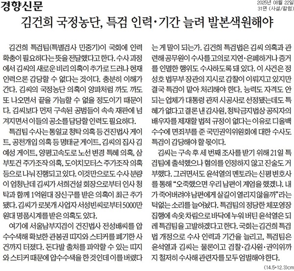동아일보는 “특검은 김 여사가 ‘그림자 권력’으로 활동하며 국정을 농단한 혐의에 수사 초점을 맞추고 있다”며 “서희건설 사위가 국무총리 비서실장에 임명된 것도, 통일교 숙원 사업을 정부가 지원하려 한 점도 김 여사가 이들로부터 보석과 명품을 받았다는 사실 없인 설명되지 않는다”고 지적했다. 이어 “대통령과 같은 등급 비화폰을 받아 민정수석과 통화하고, 삼청동 안전 가옥에 서희건설 회장을 불러들인 것도 대통령과 권력 공동체란 인식 없이는 엄두도 못 낼 일”이라고 했다.