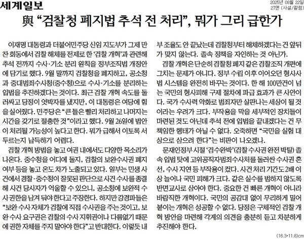 경향신문도 한일관계 개선을 기대했다. 사설 <이 대통령 ‘국가 간 약속’ 존중 뜻, 일본 ‘물 반 컵’ 화답하길>에서 “미중 경쟁에 따른 국제 질서 전환기 속에서 한일 협력의 필요성은 그 어느 때보다 크다”며 “차이를 넘어 위기에 공동 대응하고, 기회를 함께 만들어가는 것은 양국 모두의 국익에도 부합한다. 이번 정상회담이 과거를 딛고 미래로 함께 향하는 진정한 출발점이 되기를 바란다”고 했다.