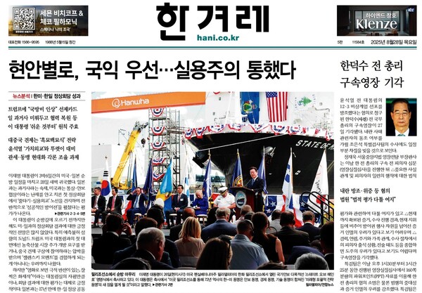 세계일보도 1면 기사 제목을 <이재명표 실용외교 ‘북핵·통상’ 진짜 시험대>로 뽑고 “향후 무역협상 후속 로드맵과 북핵 외교 중재력 등이 ‘국익 중심 실용외교’ 노선의 진짜 시험대가 될 전망”이라며 “한반도 비핵화·확장억제를 유지 및 강화하면서 북한을 움직일 방안, 미국과 우호 관계를 발전시키면서 대중 외교 관리하기, 세부 논의가 남아있는 통상 협상에서 국익 챙기기 등 과제가 산적해 있다”고 전했다.