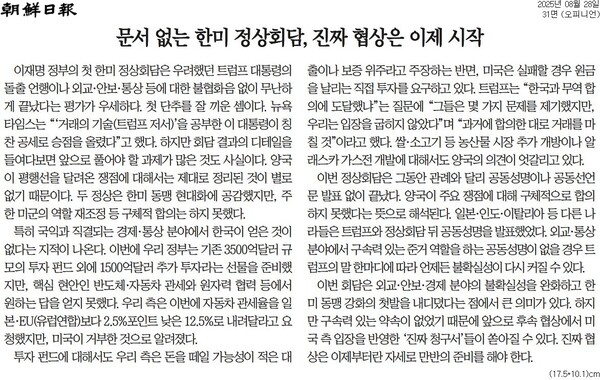 조선일보 <문서 없는 한미 정상회담, 진짜 협상은 이제 시작>