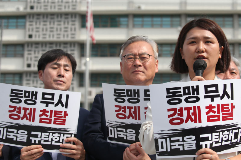 민주당·조국혁신당·진보당·기본소득당·사회민주당 등 5개 정당 소속 의원 13명은 2일 오후 서울 종로구 주한미국대사관 앞에서 ‘부당한 대미투자 요구 철회 촉구 기자회견’을 열고 “대한민국 외환보유액의 84%에 달하는 3,500억달러를 현금 선불로 지급하라는 미국의 요구는 현실적으로도 불가능하며, 대한민국 경제를 파괴하는 무도한 압박”이라며 이같이 밝혔다.
