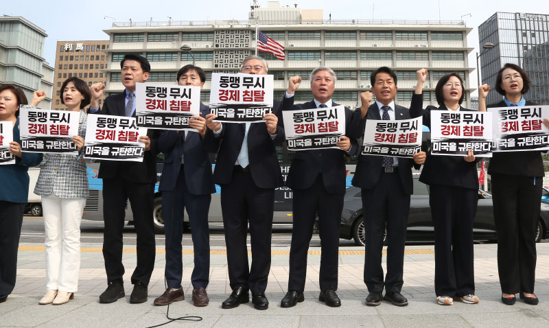 더불어민주당 등 5개 정당 의원들이 트럼프 행정부의 대미투자 요구를 ‘동맹국에 대한 경제 침탈’이라고 규정하며 미국을 향해 “대한민국에 대한 경제 침탈과 세계를 향한 수탈적 압박 시도를 당장 중단하라”고 촉구했다.