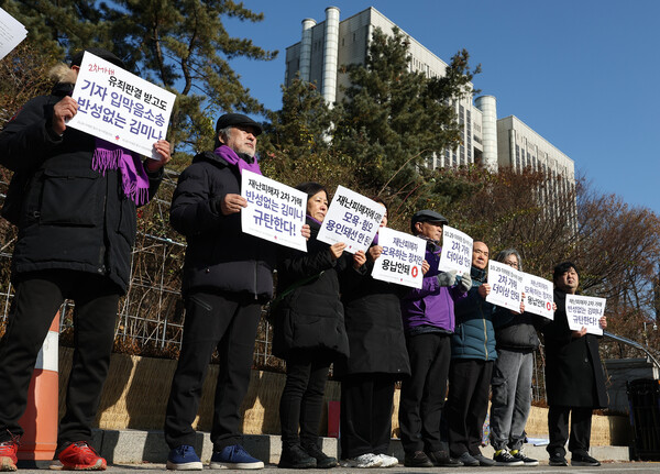 12일 서울 서초구 서울중앙지방법원 앞에서 열린 '김미나 창원시의원에 대한 2차 가해 손해배상 소송 접수 기자회견'에서 이태원 참사 유가족을 포함한 참가자들이 손팻말을 들고 있다. 2025.12.12. 연합뉴스
