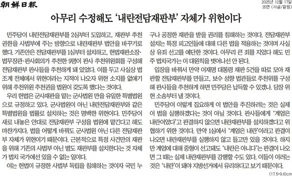 사설 <아무리 수정해도 ‘내란전담재판부’ 자체가 위헌이다>에서 조선일보는 “군사법원이 아닌 내란전담재판부와 같은 특별법원을 법률로 설치하는 것은 명백한 위헌”이라며 “법을 어떻게 바꿔도 군사법원 아닌 다른 전담재판부 자체가 위헌이기 때문이다. 근본적으로 특정 사건만의 재판을 위해 기존의 사법부 아닌 별도 재판부를 설치한다는 것 자체가 법치 국가에선 있을 수 없는 일”이라고 했다.