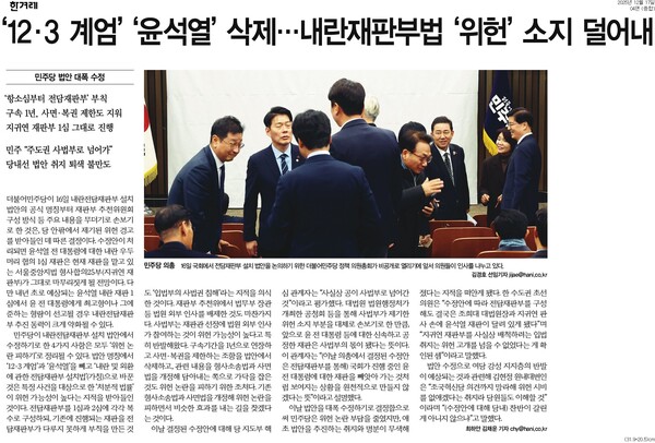 반면 한겨레는 민주당의 수정으로 위헌 소지가 상당 부분 해소됐다는 점에 주목했다. 17일자 1면 <내란재판부 2심부터 법원 외부 추천 배제> 기사에 이어 4면 <‘12·3 계엄’ ‘윤석열’ 삭제… 내란재판부법 ‘위헌’ 소지 덜어내> 기사에서 한겨레는 “민주당이 내란전담재판부 설치 법안에서 수정하기로 한 4가지 사항은 모두 ‘위헌 논란 피하기’로 정리될 수 있다”며 “사실상 공이 사법부로 넘어간 것”이라는 민주당 지도부 핵심 관계자를 인용했다.