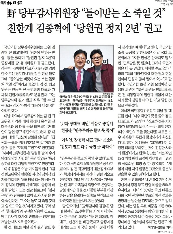 조선일보는 17일자 사설 <‘윤 어게인’ 달려가는 국힘, 당 존립 위기 맞을 것>에서 국민의힘 당무감사위원회의 중징계 권고를 “계엄 1년이 넘도록 제대로 된 사과조차 안 하는 당 지도부를 비판했다고 엄벌하겠다는 것”이라고 비판했다.
