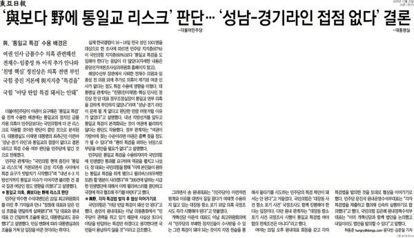 동아일보도 3면 기사 <‘與보다 野에 통일교 리스크’ 판단… ‘성남-경기라인 접점 없다’ 결론>에서 “더불어민주당이 야권이 요구해온 ‘통일교 특검’을 전격 수용한 배경에는 통일교의 정치인 금품 지원 의혹이 민주당보다는 국민의힘에 더 큰 리스크로 작용할 것이란 판단이 깔린 것으로 분석된다”라고 봤다. 대통령실 관계자는 “친명(친이재명) 핵심 인사인 정진상 전 당 대표 정무조정실장이 통일교 연루 의혹을 강하게 부인하지 않았나”라며 “성남-경기 라인이 문제 될 게 없다고 판단한 만큼 머뭇거릴 이유가 없었다”고 설명했다고 이 신문은 전했다.