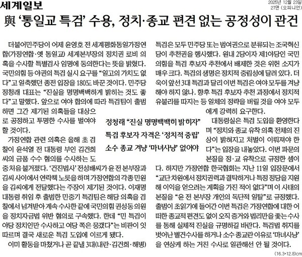 통일교가 대주주인 세계일보는 무리한 수사를 경계하는 주장을 폈다. 이 신문은 <與 ‘통일교 특검’ 수용, 정치·종교 편견 없는 공정성이 관건>에서 “특검의 생명은 정치적 중립성에 달려 있다”라며 “향후 특검 후보자 추천 과정에서 정치적 유불리를 따지는 등 일체의 정략을 버릴 것을 여야 모두에게 강력히 요구한다”라고 주문했다.