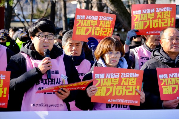 그러면서 “중노위의 조정안은 적정 임금은커녕 최저임금 수준을 겨우 맞추는 후퇴안”이라고 말하며 “노동조합은 이마저도 수용하며 양보했는데, 기재부는 총인건비 지침 위반에는 종이 한 장의 잣대를 들이대며 노동자들의 생존권을 가로막고 있다”고 전했다.