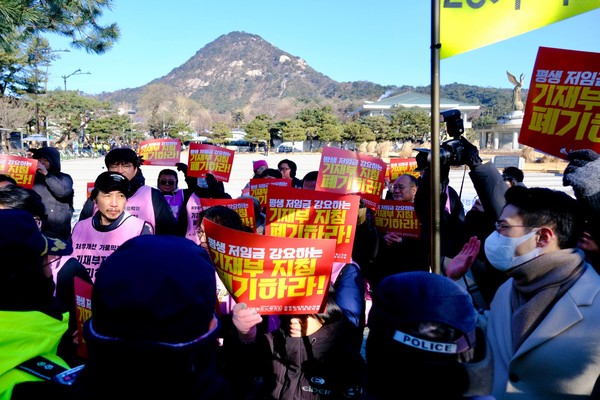 이들이 청와대까지 와서 경찰의 저지에도 신문고를 울린 까닭은, 이재명 대통령이 지시한 공공부문의 적정 임금 지시를 각 부처가 이행하지 않기 때문이다. 그 결과 20년 차 노동자도 1년 차 노동자와 다르지 않은 최저임금 수준의 임금을 받고 있다.