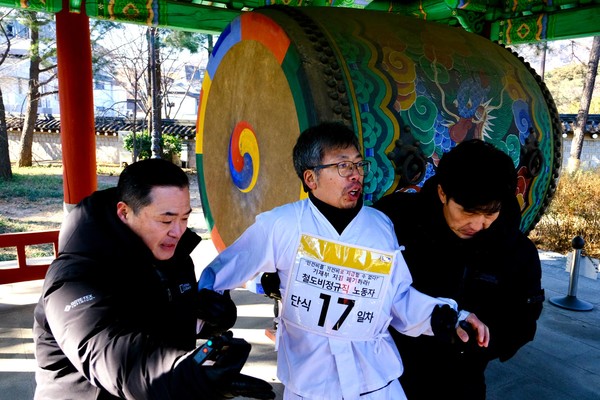 대통령실에서 청와대 복귀한 뒤, 5일 만에 신문고가 울렸다. 17일째 단식 중인 서재유 코레일네트웍스 지부 수석 부위원장의 손에 의해서다. 경찰에 의해 끌려 내려온 서 수석은 “노동자도 함께 빛의 혁명을 이뤘으나 우리 삶은 전혀 변하지 않았다”고 억울함을 호소했다.