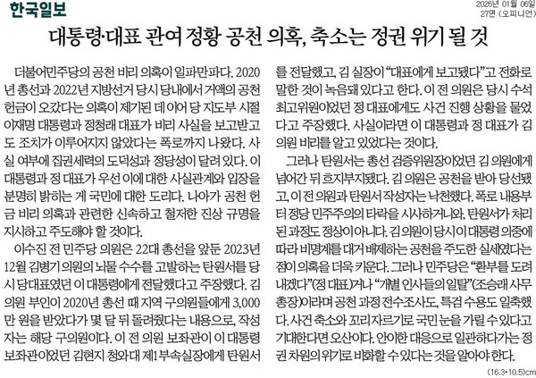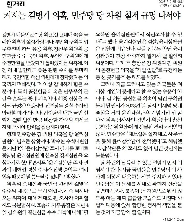 김병기 의원 금품수수 탄원서 무마 논란을 두고 한국일보는 “폭로 내용부터 정당 민주주의의 타락을 시사하거니와, 탄원서가 처리된 과정도 정상이 아니다”라며 “안이한 대응으로 일관하다가는 정권 차원의 위기로 비화할 수 있다는 것을 알아야 한다”고 경고했다.