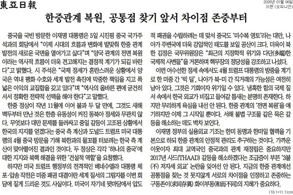 동아일보는 사설 <한중관계 복원, 공통점 찾기 앞서 차이점 존중부터>에서 “한중 정상이 작년 11월에 이어 불과 두 달 만에, 그것도 새해 벽두부터 만난 것은 한층 유동성이 커진 동북아 정세와 무관치 않다”라며 “무엇보다 대만 문제를 둘러싸고 중일 갈등이 고조된 상황에서 한국의 지지를 얻겠다는 중국 측 계산과 도널드 트럼프 미국 대통령의 4월 중국 방문을 기해 북한과의 물꼬를 터보려는 한국 측 계산이 맞아떨어진 결과”라고 봤다.