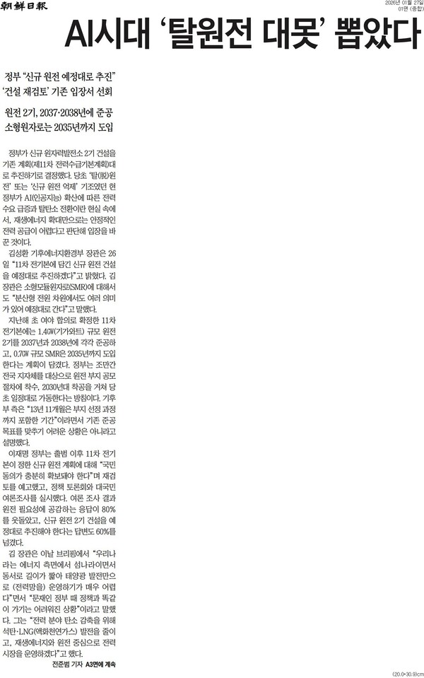한국일보는 김성환 장관이 지난 5개월 동안 어떤 진전된 논의를 통해 입장이 정리됐는지는 제대로 설명하지 못했다는 점에 주목했다. 두 차례 정책토론회에서도 내세울 만한 뾰족한 논의는 없었고, 한국갤럽 여론조사에서 신규 원전 건설 찬성(69.6%)이 반대(22.5%)보다 3배 이상 높다는 결과가 나온 게 사실상 전부라고 지적했다. 이 신문은 “인공지능(AI) 시대 안정적 전력 확보가 절실하다는 지적이 거세지자 여론조사를 구실 삼아 입장을 선회한 것 아니냐는 탈원전 진영의 비판이 나오는 대목”이라고 전했다. 한국일보는 다만 “정권이 바뀔 때마다 뚜럿한 근거도 없이 뒤틀리는 일은 더 이상 되풀이되지 말아야 한다”라고 했다.