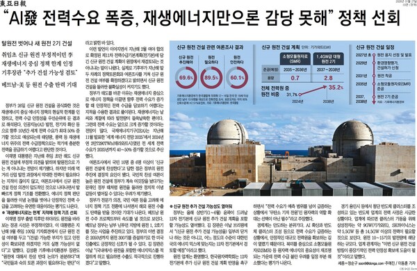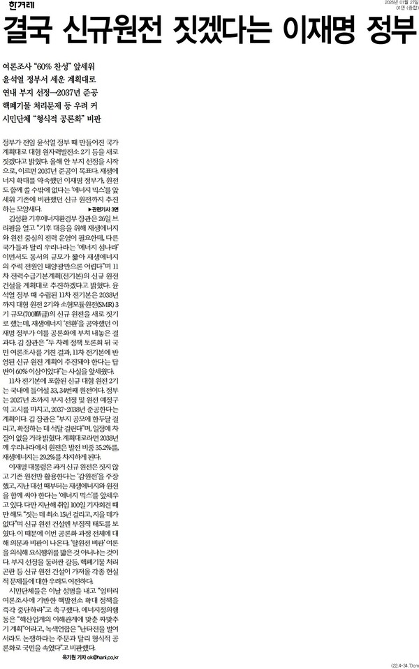 한겨레는 “몇달 전만 해도 정부는 전임 정부가 수립한 11차 계획을 존중하지만 신규 원전을 짓는 문제는 공론화를 거쳐 결정한다는 방침이었다”라며 “하지만 정부 내 기류는 인공지능(AI) 데이터센터 등에 안정적인 전력 확보가 필요하다는 업계 요구가 커지면서 급변했다”라고 지적했다. 정부는 지난 연말 정책 토론회를 열고 공론화에 착수했지만 정책토론회에서는 원전의 경직성을 어떻게 완화할지에 대한 기술적 논의만 이뤄졌을 뿐이고 여론조사에선 원전이 마치 불가피한 해법인 양 유도된 질문으로 중립성 논란을 초래했다고도 우려했다.