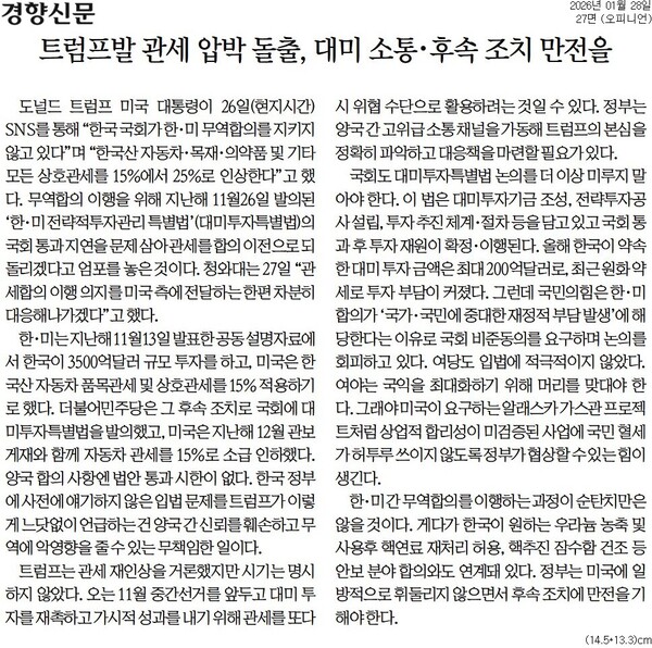 경향신문 사설 <트럼프발 관세 압박 돌출, 대미 소통·후속 조치 만전을>은 “트럼프는 관세 재인상을 거론했지만 시기는 명시하지 않았다. 오는 11월 중간선거를 앞두고 대미 투자를 재촉하고 가시적 성과를 내기 위해 관세를 또다시 위협 수단으로 활용하려는 것일 수 있다”며 “정부는 양국 간 고위급 소통 채널을 가동해 트럼프의 본심을 정확히 파악하고 대응책을 마련할 필요가 있다”고 전했다. 국회도 대미투자특별법 논의를 더 이상 미루지 말아야 한다고 조언했다.