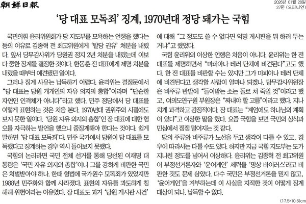 조선일보 <‘당 대표 모독죄’ 징계, 1970년대 정당 돼가는 국힘> 사설에서는 “지금 국힘 지도부는 도가 지나친 정도를 넘어서 이상하다”라며 “윤리위는 김종혁 전 최고위원이 부정선거론자와 ‘윤어게인’ 세력을 ‘망상 바이러스’라고 비판한 것도 문제 삼았다. 다수 국민은 부정선거론을 믿지 않고, ‘윤어게인’을 거부하는데 이 사실을 지적한 것이 어떻게 징계 대상이 되나. 납득할 수 없다”고 전했다.