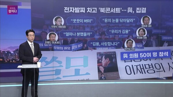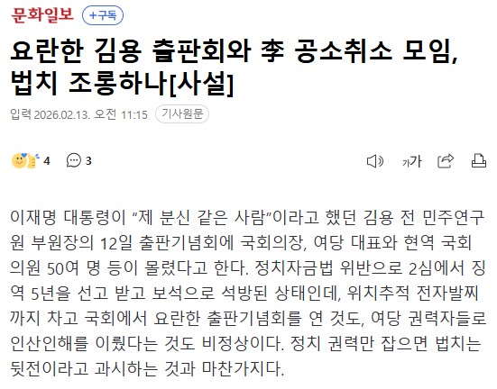 문화일보는 지난 13일 <요란한 김용 출판회와 李 공소취소 모임, 법치 조롱하나>라는 제목의 사설에서 "이재명 대통령이 '제 분신 같은 사람'이라고 했던 김용 전 민주연구원 부원장의 12일 출판기념회에 국회의장, 여당 대표와 현역 국회의원 50여 명 등이 몰렸다고 한다"며 "정치자금법 위반으로 2심에서 징역 5년을 선고받고 보석으로 석방된 상태인데, 위치추적 전자발찌까지 차고 국회에서 요란한 출판기념회를 연 것도, 여당 권력자들로 인산인해를 이뤘다는 것도 비정상이다. 정치 권력만 잡으면 법치는 뒷전이라고 과시하는 것과 마찬가지"라고 주장했다. 이 사설은 아직도 문화일보 홈페이지와 포털 사이트에 그대로 게재돼 있다.