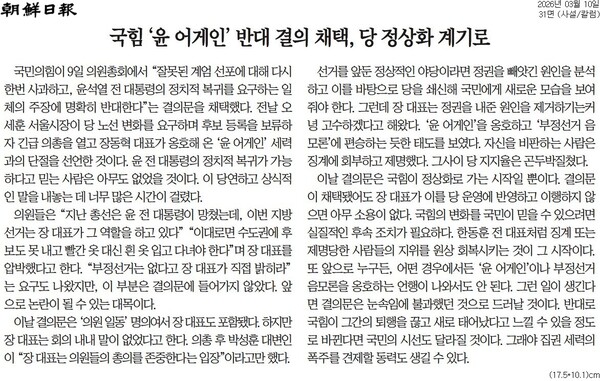 조선일보는 사설에서 한 전 대표 복귀를 주문했다. 10일 <국힘 ‘윤 어게인’ 반대 결의 채택, 당 정상화 계기로> 사설에서 조선일보는 “이날 결의문은 국힘이 정상화로 가는 시작일 뿐이다. 결의문이 채택됐어도 장 대표가 이를 당 운영에 반영하고 이행하지 않으면 아무 소용이 없다”며 “국힘의 변화를 국민이 믿을 수 있으려면 실질적인 후속 조치가 필요하다. 한동훈 전 대표처럼 징계 또는 제명당한 사람들의 지위를 원상 회복시키는 것이 그 시작”이라고 했다.