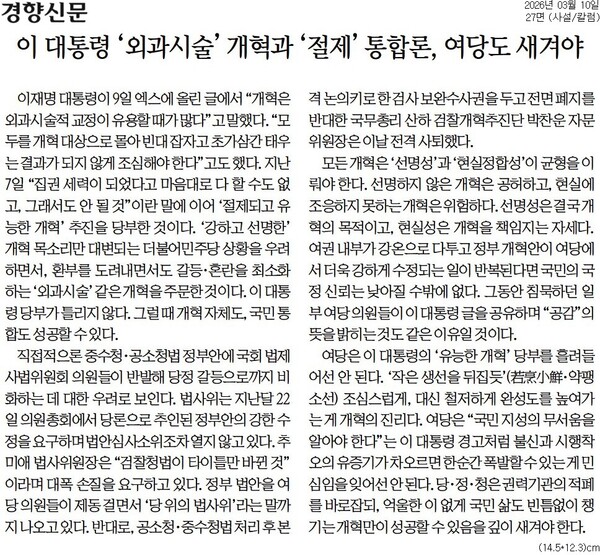 10일자 6면 한겨레 <이 대통령 “초가삼간 다 태워서야”… 검찰개혁 강경파 제동> 기사에 따르면 이 대통령은 ‘대공소청-고등공소청-지방공소청’으로 이어지는 3단계 구조를 ‘공소청-지방공소청’ 2단계로 바꾸는 것은 동의하지만, 검찰총장 명칭을 공소청장으로 변경하거나 검찰청 검사의 공소청 검사 전환 시 면직 후 재임용 심사를 거치도록 하자는 방안에 대해선 받아들이기 어렵다는 뜻을 당에 전달한 것으로 알려졌다.