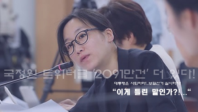 장 의원의 주장이 틀렸나. 그녀가 펼쳐 든 신문의 내용 속에 명시된 게 국정원의 트위터글 2,091만 건…! 새누리당이 개거품을 문 이유는 이런 사실을 감추어 보고 싶었던 속내가 없었던 것도 아닐진데, 이들은 굳이 바뀐애가 '국민이 선택한 대통령' 내지 '대통령 흠집내기,근거없는 쿠데타' 혹은 '국민의 결정을 뒤집는 망언'이라며, 국민들이 진보당 처럼 심판하게 될 것이라고 으름장을 놓고 있다. 방귀 뀐 놈이 오히려 성질 내는 꼬락서니.