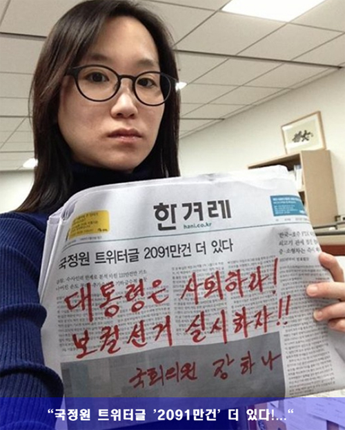 사정이 이러하므로 댓글로 권력을 빼앗긴 사람들의 상실감은 무엇으로 표현할 수 없을 정도일 것. 그런 현상이 민주당 장하나 의원으로부터 발현된 것이다. 참 용기있는 행동이었다. 장 의원은 '국정원 트위터글 2091만건 더 있다'라는 보도를 접하자 마자, '대통령은 사퇴하라! 보궐선거 실시하자!'며 신문지에 자기의 의사를 표현하며 성명서를 발표했다. 장 의원의 주장이 SNS를 타고 급속히 전파되자 당황한 곳은 새누리당. 새누리당은 당황한 기색이 역력한 가운데 황당한 주장으로 장 의원을 공격했다. 이렇게!!...