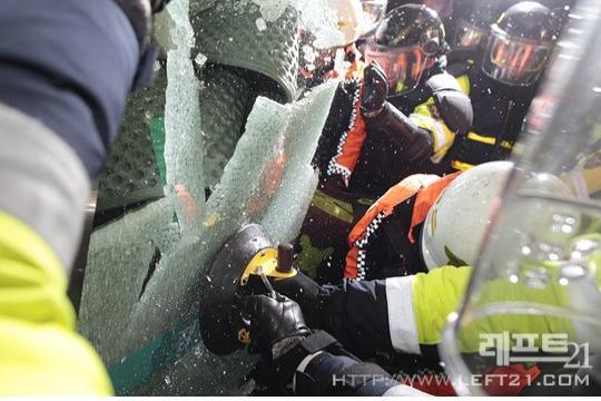 <그림 2> 12월 22일 경찰이 경향신문사에 위치한 민주노총 사무실에 유리를 부수며 진입 시도하고 있다.(자료 : 레프트21)