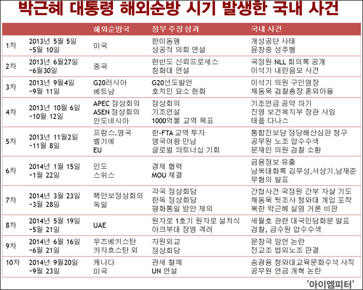 조금 더 구체적으로 박근혜 대통령의 해외 순방 시기 벌어진 일들의 특징을 살펴보겠습니다.